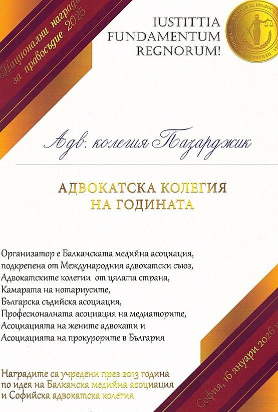 Адвокатска колегия – Пазарджик е отличена с приза - „Адвокатска колегия на годината за 2025 г.“